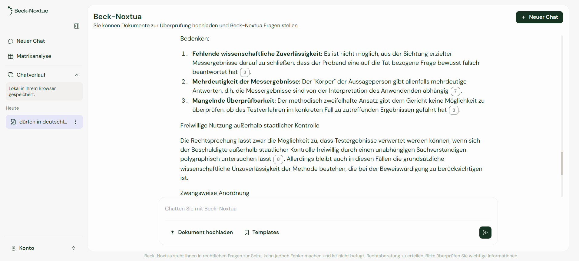 MANZ-Noxtua ermöglicht schnelles, zielgerichtetes Recherchieren: Nutzer:innen können komplexe Rechtsfragen in natürlicher Sprache stellen. Es werden präzise Antworten mit Referenzen auf relevante Gesetze, Urteile und Fachliteratur geliefert.